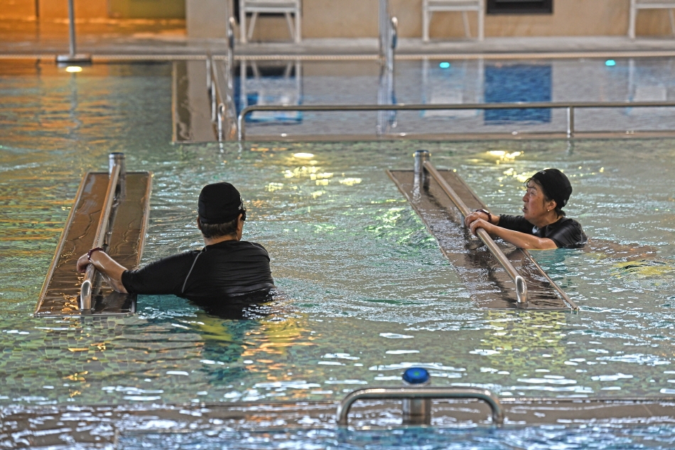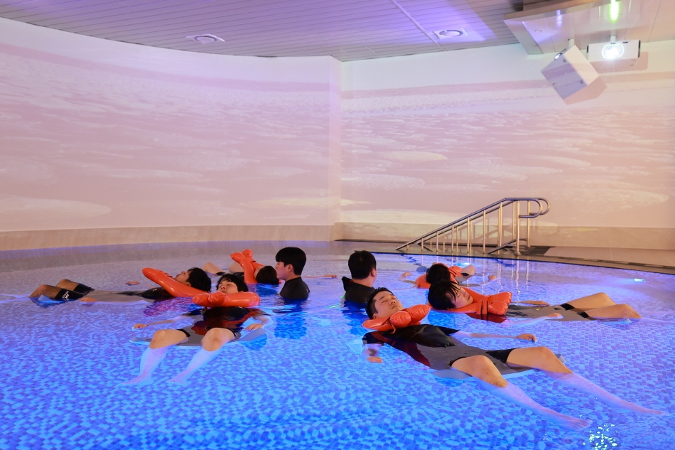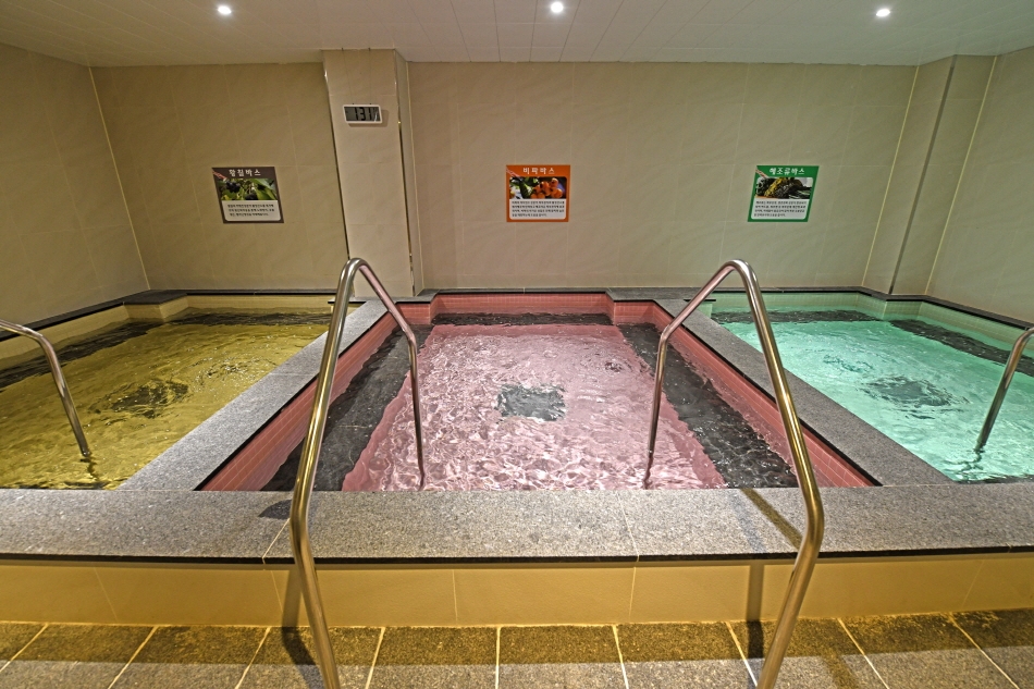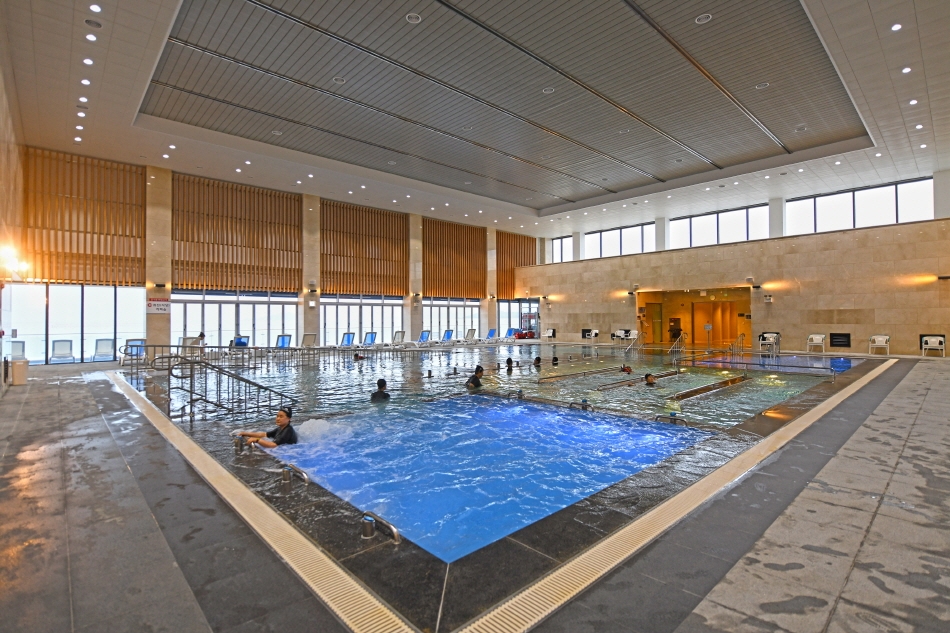 На первом этаже двухэтажного Центра морского оздоровления Вандо расположено пространство для проведения базовых программ. Здесь обустроены талассобассейн, бассейн для медитации, помещения для терапии с пеной из морских водорослей, грязевой терапии и терапии с использованием морского тумана. Талассобассейн, оборудованный зонами для гидромассажа, такими как пузырьковый массаж, массаж при ходьбе и dream bath, которые эффективно снимают усталость и облегчают боли, прекрасно подходит как для гидротерапии пожилых людей, так и для детских игр в воде. Не пропустите бесплатные занятия по водной гимнастике с профессиональным инструктором (в 11:00, 14:00 и 16:00). В талассобассейне температура воды поддерживается на уровне около 36℃, что близко к температуре тела человека.