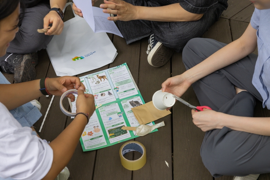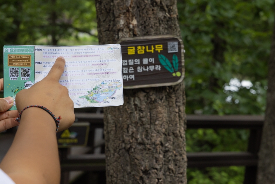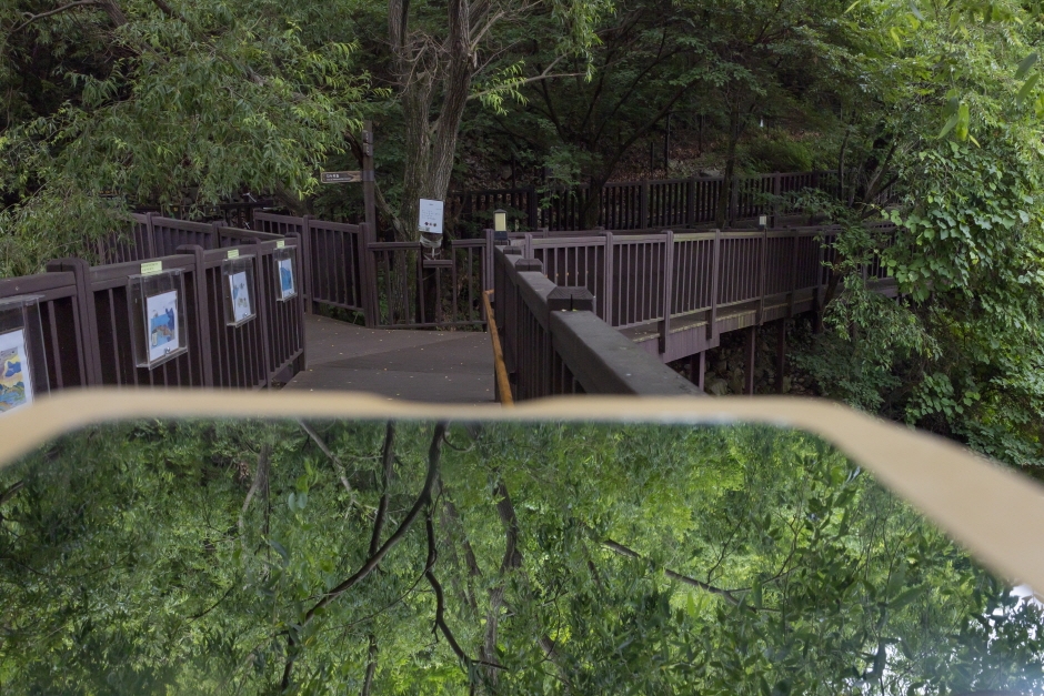 Точно так же, как вблизи что-то кажется другим миром, так и если отвести взгляд вдаль, виднеется нечто, напоминающее гигантскую скульптуру. Там, куда показывает экскурсовод, видна гора Кымосан, которую называют «Вабульсан» за ее сходство с изображением лежащего Будды. Во время прогулки по тропе с деревянным настилом можно услышать рассказы деревьев. Участники срывают листья зантоксилума схинусолистного, который не любят насекомые, вдыхают их запах, и подносят зеркало к носу, чтобы взглянуть на небо под другим углом. Другой способ слушать, наслаждаться и открывать для себя истории леса – программа «Бинго пяти чувств».