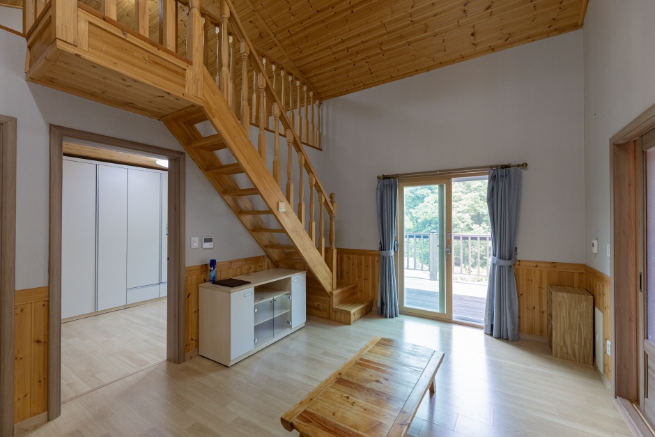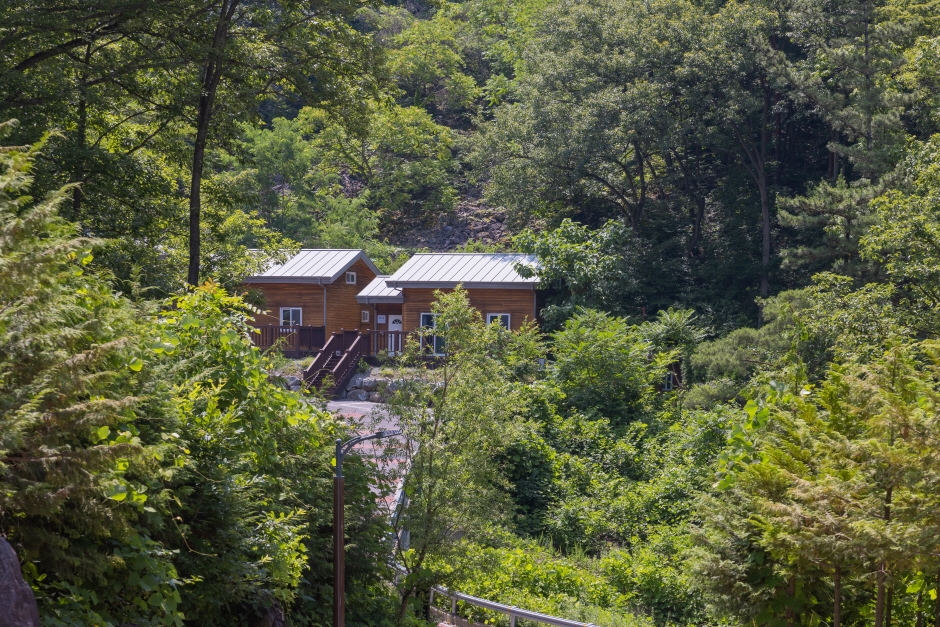 Дома для групп расположены у входа в Национальный центр лесных активностей Чхильгок, а домики, рассчитанные на 2 и 5 человек, находятся выше. Поскольку там мало посетителей и место тихое, создается ощущение отдыха в лесу. У домов очаровательный внешний вид, напоминающий маленькие лесные хижины, а внутри расположено уютное пространство, залитое солнечным светом. Дома имеют двухэтажную планировку, а за окнами простирается зеленый мир. Это отличное место, чтобы ненадолго забыть о сером городе с лесом из зданий.