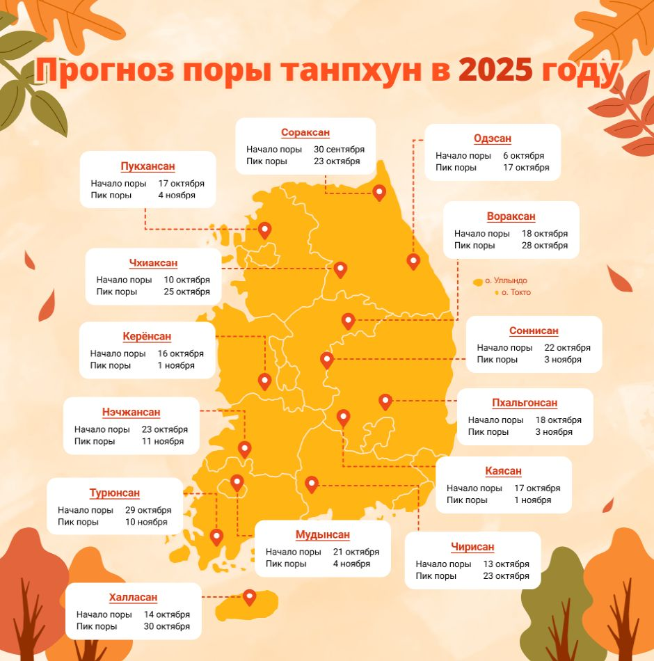 Осенние ветра приносят свежесть и прохладу и сменяют жаркое лето, а вместе с этим зеленое одеяние леса окрашивается разноцветными осенними красками. В 2025 году первыми сменят цвет листья деревьев в Национальном парке гор Сораксан 30 сентября; далее в горах Чирисан эта пора начнется предположительно с 13 октября, в горах Халласан – 14 октября, а следом, примерно с 17 октября – в горах Пукхансан. Пик поры танпхун во всех регионах страны предположительно наступит спустя две недели после начала, в период между серединой октября и первыми днями ноября. В горах Сораксан и Чирисан пик поры ожидается на 23 октября, в горах Халласан на острове Чечжу – на 30 октября, в горах Пукхансан – на 4 ноября, а в горах Нэчжансан – на 11 ноября.