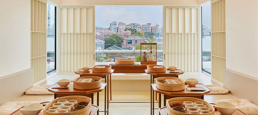Магазин корейского чайного бренда «Осоллок» (OSULLOC) в отреставрированном ханоке. Здесь можно попробовать традиционный чай, мороженое, чизкейк и другие десерты и напитки со вкусом зеленого чая.