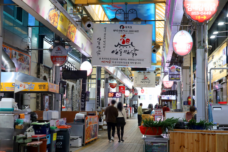 Так называемый «переулок жареной курицы», на котором с 1970-х гг. продавали жареную или свежую курицу, находился на старом рынке в Андоне. Но с тех пор, как начала набирать популярность курица, жаренная в соусе, продавцам в «курином переулке» нужно было что-то предпринимать, чтобы спасти свое дело, и именно в это время появилось блюдо фьюжн – «ччимтак по-андонски». Это блюдо готовится в соусе кальби с крахмальной лапшой, разными овощами и с добавлением небольшого количества воды. Благодаря остро-сладкому вкусу, невысокой цене и большому объему оно стало до такой степени популярно по всей стране, что «переулок жареной курицы» стал называться «переулком блюда ччимтак». Сейчас здесь сконцентрировано около 30 торговых лавок, которые каждые выходные посещает около 20 тысяч туристов. Хотя «ччимтак по-андонски» не является традиционным корейским блюдом, рецепт которого передавался с давних пор, если заглянуть в самые древние корейские кулинарные книги «Суунчаппан» (дословно: изысканная кулинарная культура приготовления различными способами) и «Ымсиктимипан» (дословно: инструкция по приготовлению хорошей еды), то в них можно найти описание способа приготовления, издавна использовавшегося в районе Андон и схожего со способом приготовления тушеной курицы по-андонски. Это полезное питательное блюдо богато белками, а также различными питательными веществами и витаминами, содержащимися в овощах.